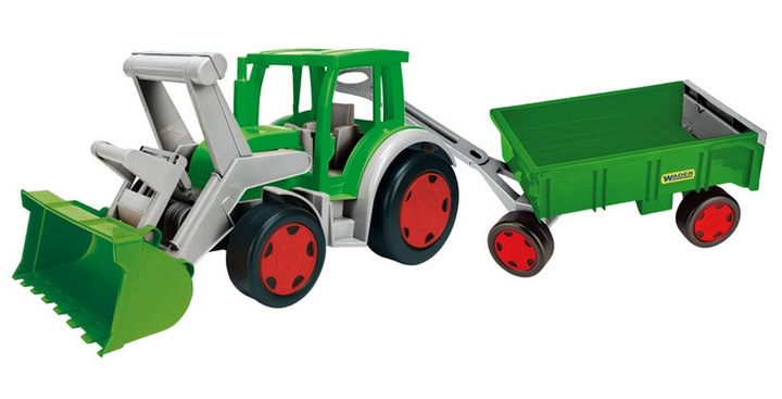 Traktor został wyposażony w ruchomą łyżkę, która pełni funkcję zarówno spychacza, jak i ładowarki, co dodatkowo uatrakcyjnia użytkowanie i pozwala dziecku na lepsze poznanie działania prawdziwych maszyn.
